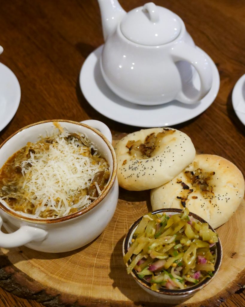 Białysy to wytrawne bułeczki drożdżowe z wgłębieniem w środku, apetycznie wypełnionym cebulą, oprószone makiem i gruboziarnistą solą. Można zajadać się nimi samemu, nadziewać (nawet pastrami!) lub traktować jako dodatek do dania głównego. W restauracji polecamy spróbować zwłaszcza gęsiny, która jest specjalnością tutejszej kuchni. Świetnie przyrządza się tu na żydowską modłę gęsi pipek, czyli duszone w cebuli i rozgrzewającej mieszance przypraw gęsie żołądki, podane w kociołku z tartym serem i oczywiście z koszyczkiem białysów.